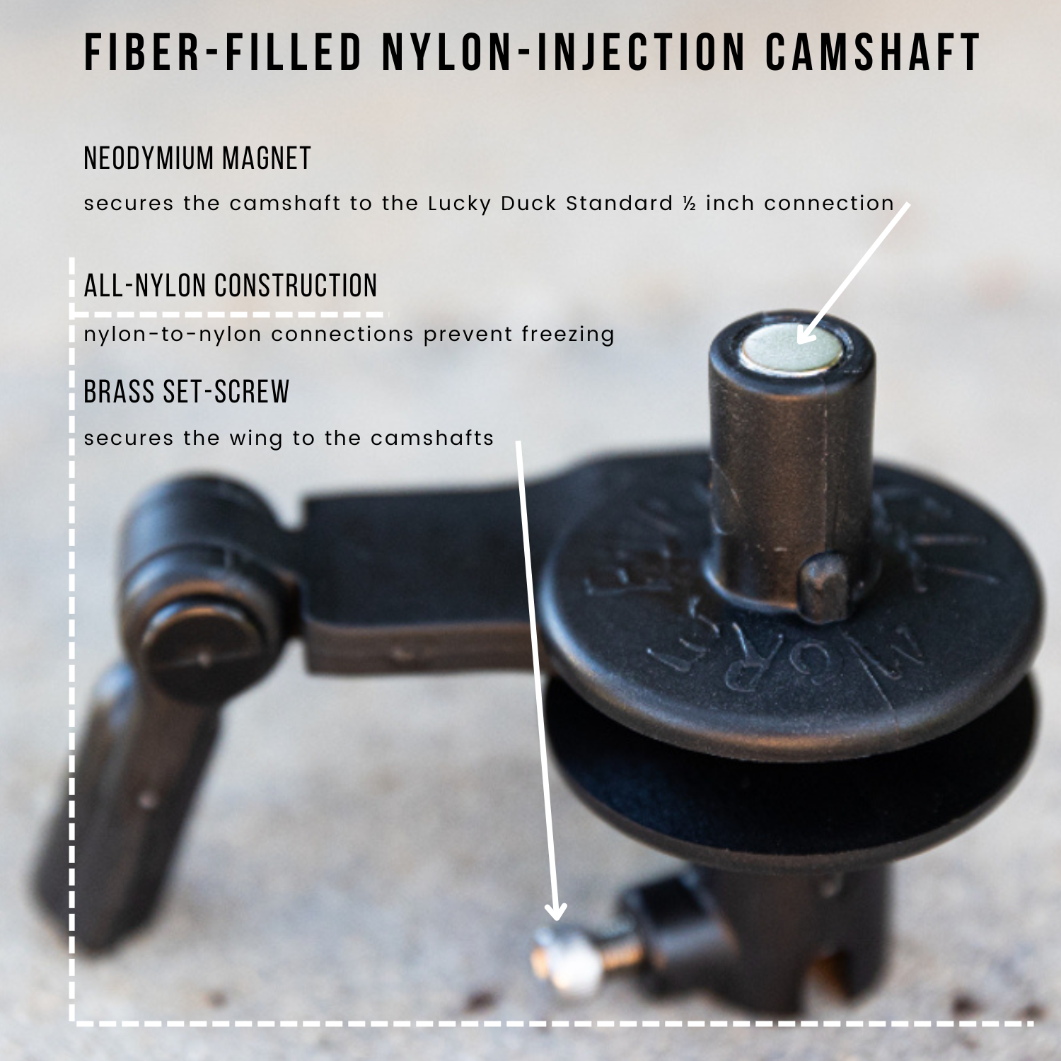The Lucky Duck Animator is a PRESSURE-FIT camshaft. Meaning, it will need to be pressed into the decoy motor mount with a gentle force to attach the magnets.