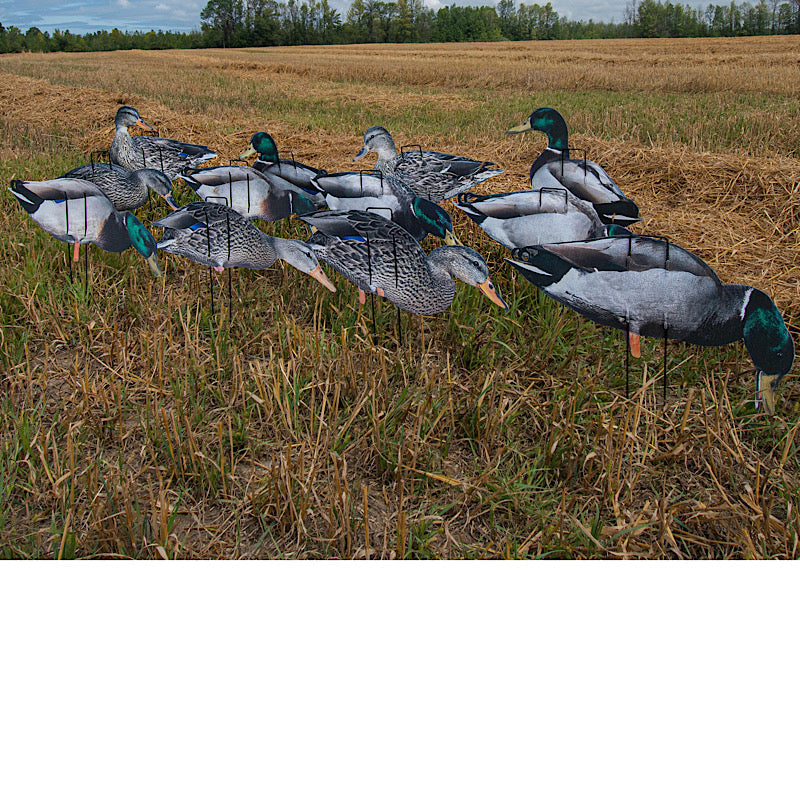 The Pro II Lite Mallards are packaged with 12 separate poses per dozen. These silhouettes weigh only 5 lbs. per dozen so that hunters can easily manage the large number of decoys associated with hunting ducks.