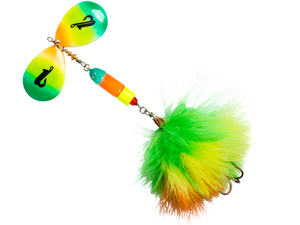 Show Musky, Tiger Muskie and Pike who's boss with this Bad Boy Bucktail. This bucktail has the perfect amount of thump and vibration and a unique profile making it the perfect bucktail for targeting tiger muskies, musky and pike. This advanced bucktail design coupled with Livingstons EBS makes this a big fish magnet. This Bad Boy has custom blades that are hand finished and powder coated and custom skirts that make them the perfect size for tiger muskie, musky and pike. Bad Boy Bucktail is simple to use, cast it out and turn the handle and get ready for a strike!