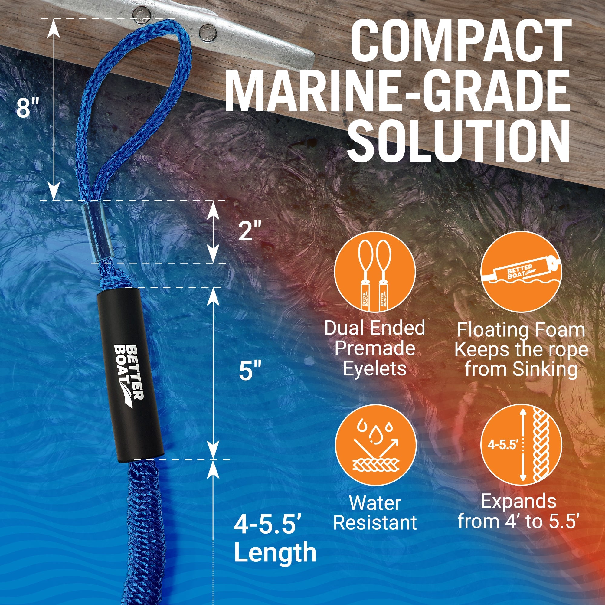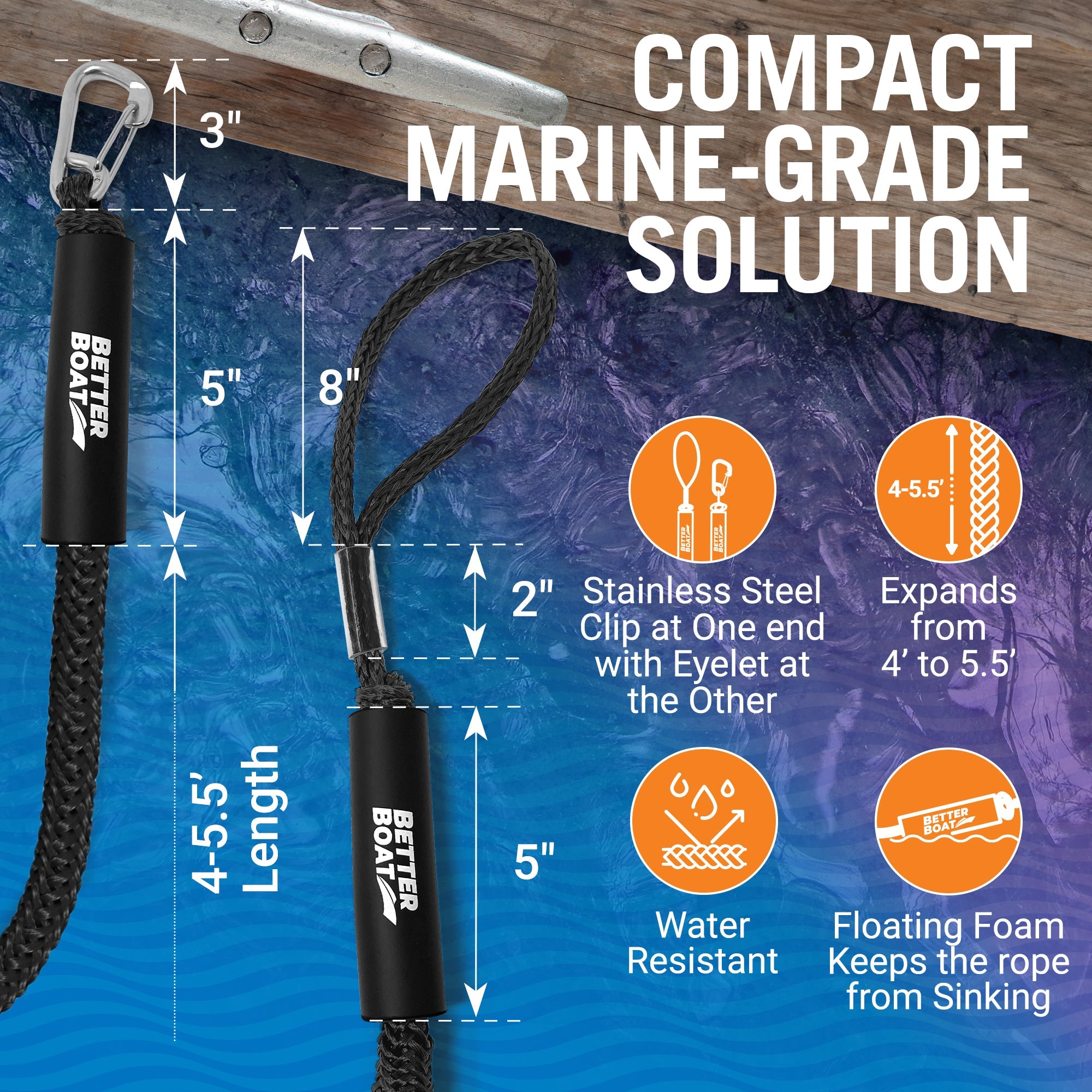 • ROBUST, QUICK-DRYING MATERIALS:Built to endure severe conditions, our marine-grade boat accessories feature double braided, UV-resistant dock ropes suitable for vessels up to 4000 pounds, with a tensile strength of 2200 pounds.