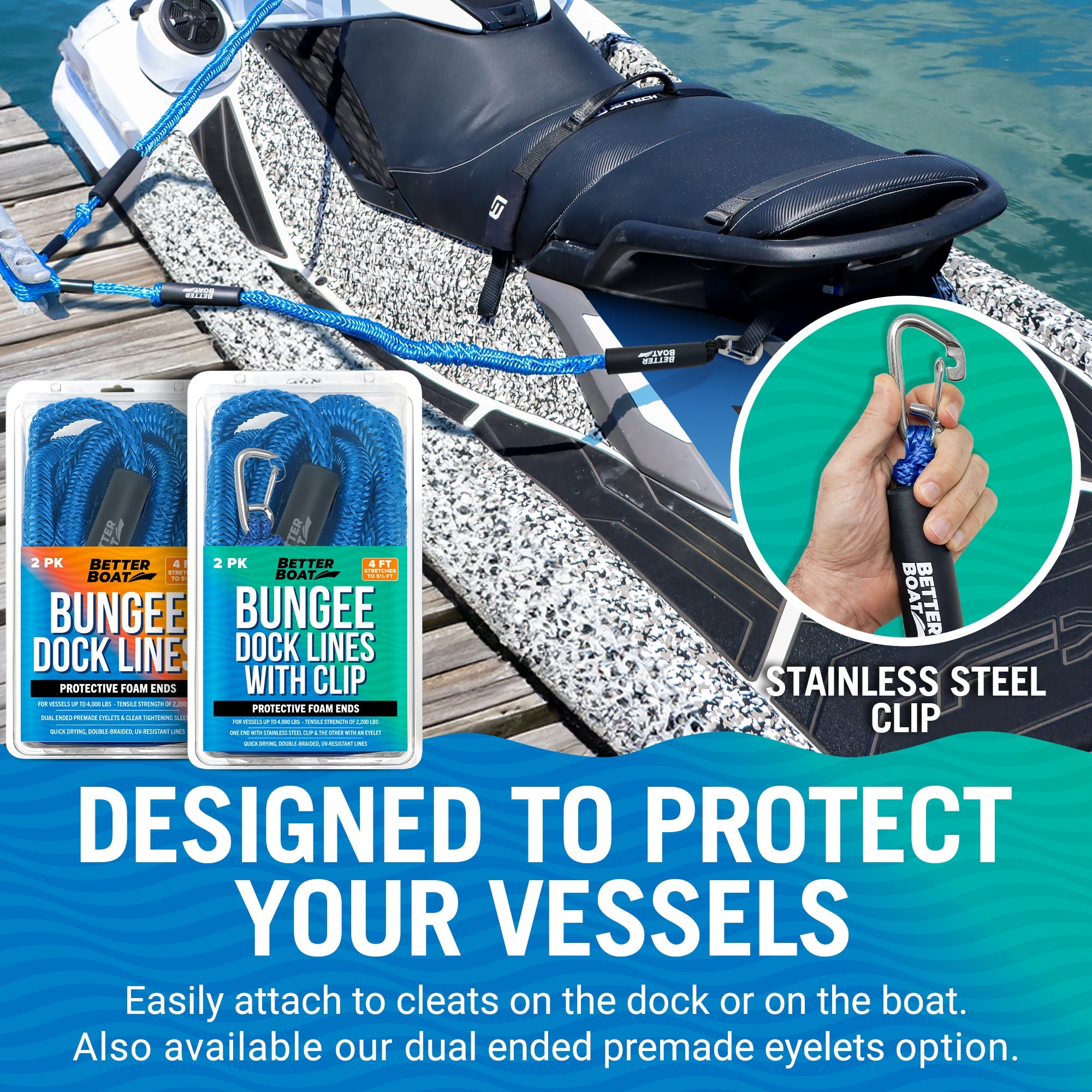• COMPACT, EASY STORAGE DESIGN: Designed to expand from 4 feet to 5.5 feet, our bungee dock lines for boats can be neatly rolled for storage on your jet ski or boat, or left at the dock. Choose from options including a stainless steel clip or simple bungee ties for docking.