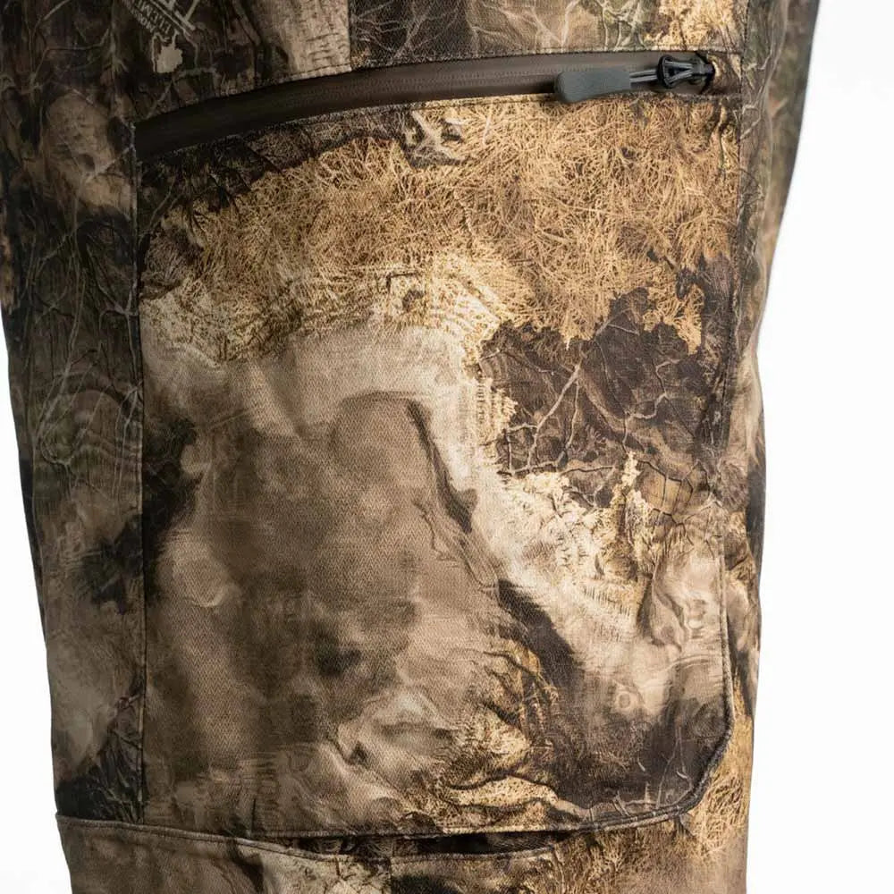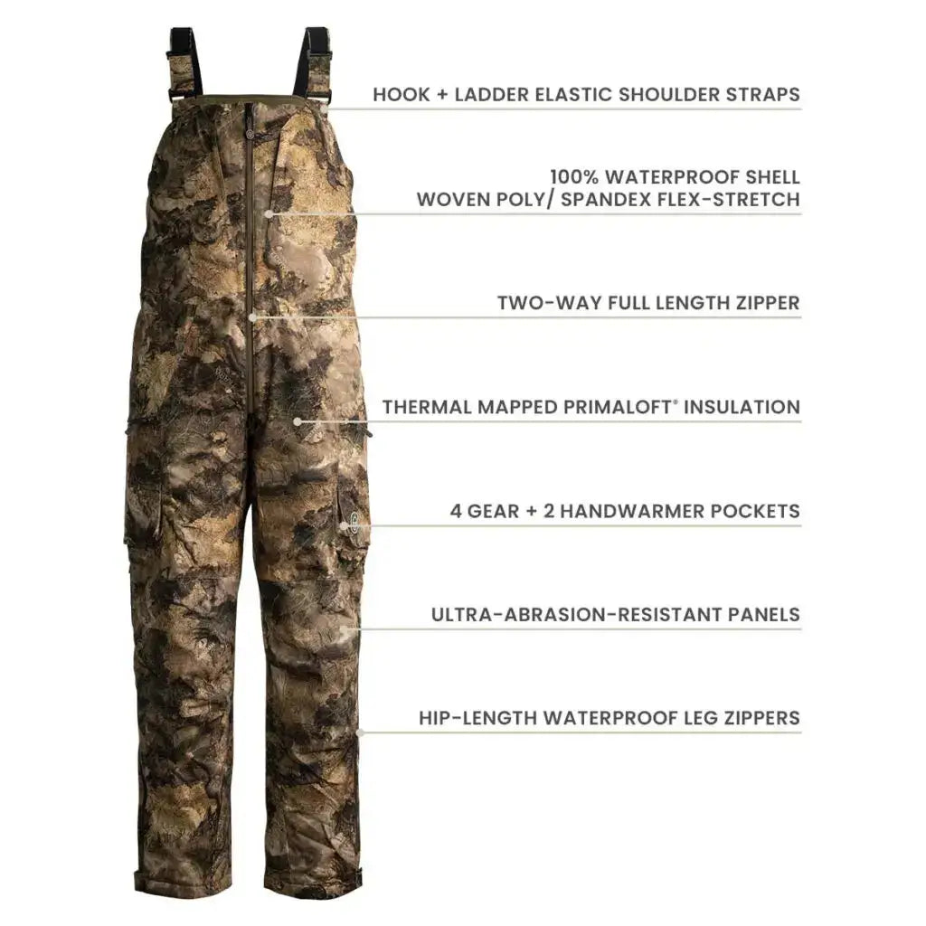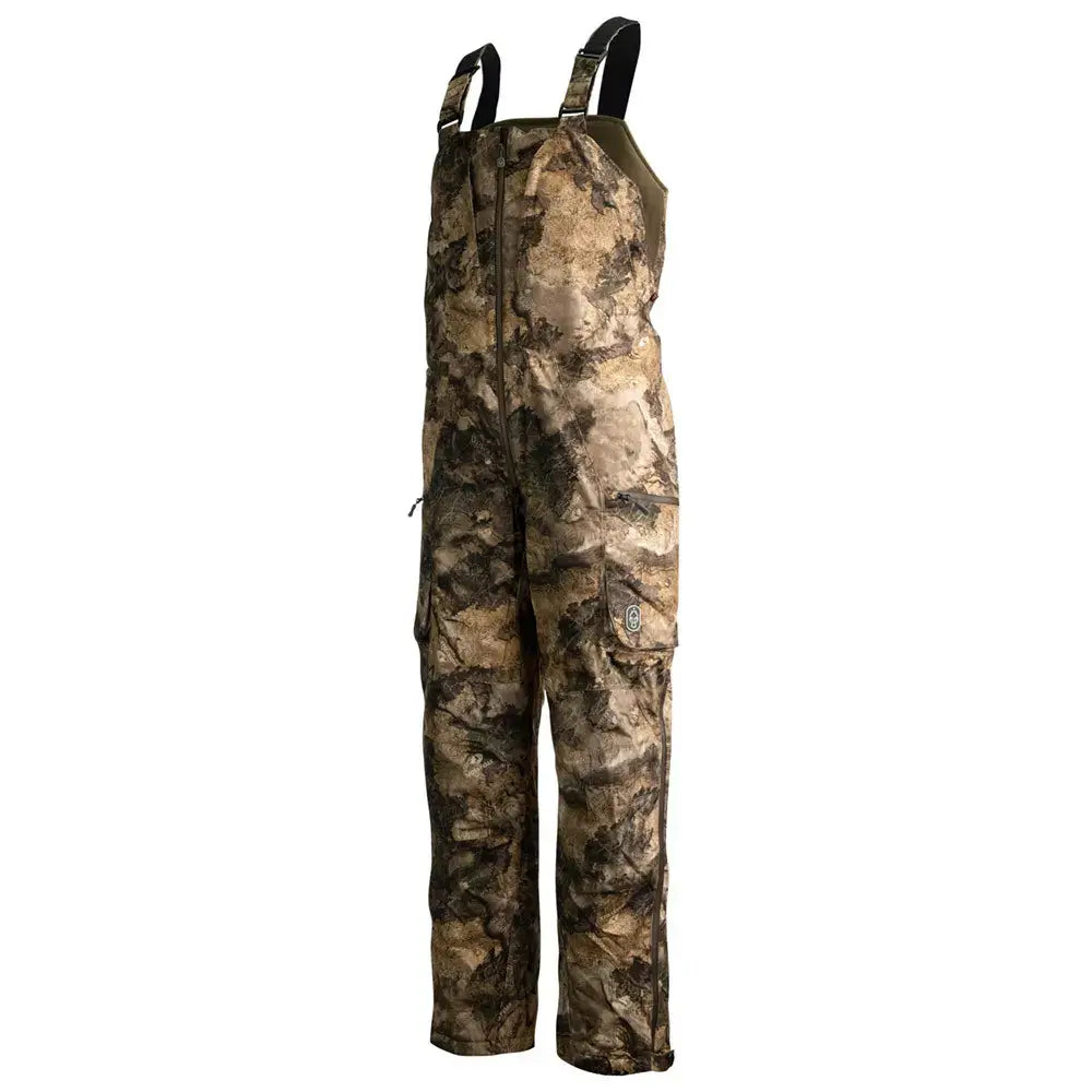 A quality pair of bibs is an essential must-have item for field hunting. When the fields become as hard and cold as the northern tundra reach for your Finisher Extreme Bibs, which are made for working and waiting. Ultra-abrasion-resistant overlay panels fortify at specific points of wear and tear. Count on 100% waterproof/breathable laminated performance via the woven poly/spandex flex-stretch shell enhanced with DWR. The advantages of thermal mapping and lightweight Primaloft® insulation will become apparent the first time you wear these bibs. (100g in the upper body / 80g in the legs). Hook and ladder adjustable elastic shoulder straps guarantee that you won’t be constantly pulling them up. Hip-length waterproof leg zippers provide easy on/off access even with boots on. The rugged, two-way YKK main zipper makes it easy to zip up to repel a chill or quickly zip down when Mother Nature calls. You can never have too many pockets. Chest pockets can hold headlamps and glasses, cargo pockets excel with more significant items, and fleece-lined hand warmer pockets prevent numb digits.